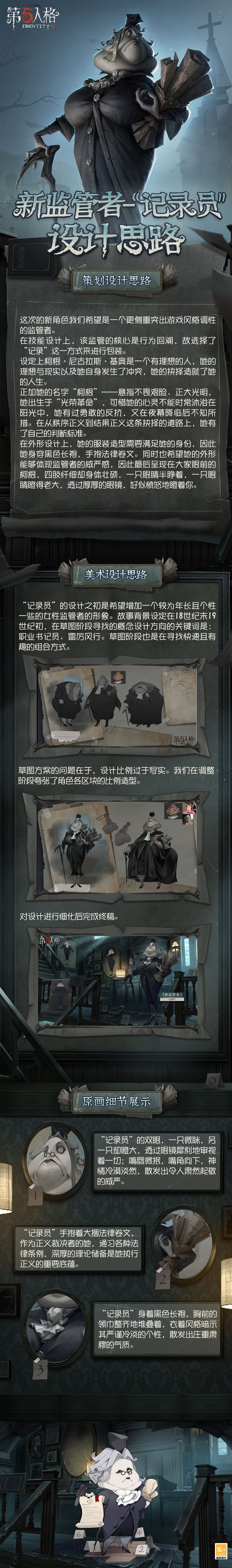 - 虽然人气在同人圈中不尽人意,但其在bilibili的角色故事PV是第五人格角色中第二个播放量突破300万的,也是彼时播放量第二高的角色PV。2024年5月,记录员的角色故事PV播放量已超越红夫人,成为播放量最高的角色PV。