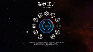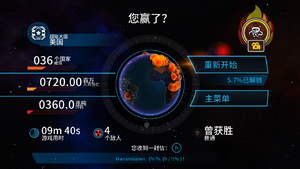游戏结局是:核大战后世界上只有一个国家幸存。胜利界面上会显示本局游戏游戏内所使用的所有核导弹的当量总和、总死亡人数、摧毁国家(指领土)总数。旁边的地球上会标出所有受打击的地方。