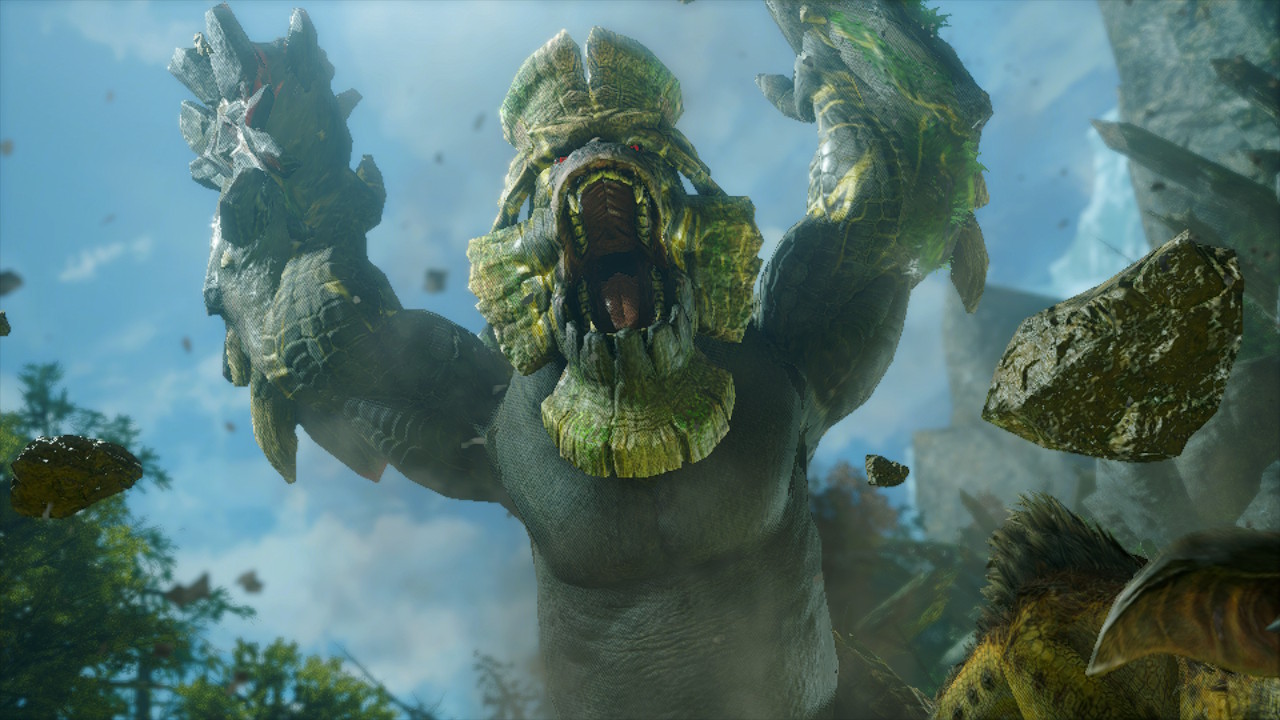 - 武装前臂:愤怒后,前臂插入土中,左臂包裹上岩浆,右臂包裹上苔藓,分别赋予前臂爆破属性和水属性,武装完成后发出大龙吼