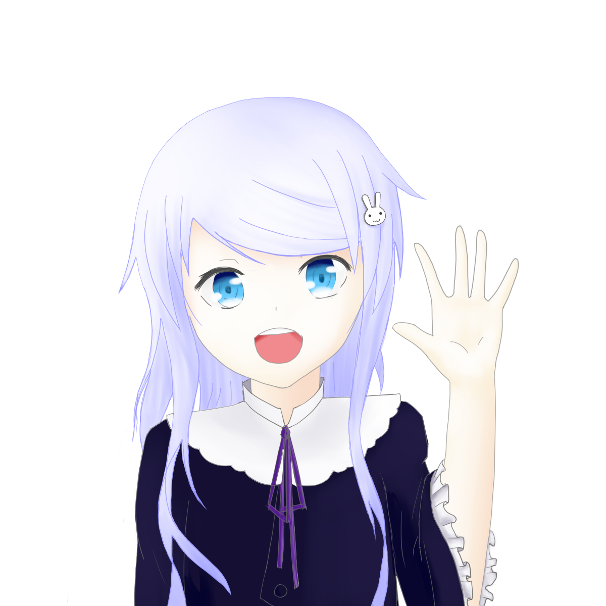 发色为白色,带有淡淡的紫色。左侧别着一枚兔子样式的发卡。兔子的表情会随本体的心情而变化。