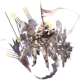 - 手持武器包方案另一例:《战舰少女》中的伊丽莎白女王。和声望“手持大号模型”的方案比起来,舰载武器拟物化成矛盾组合的方案明显更加自然。