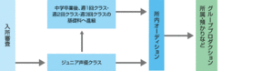 - 面向声优业界的偶像化潮流。每周两次的班级,每周分别会有一次“演技”和“主唱”的课程。每周3次的班级,每周都会各进行一次“演技”、“主唱”、“舞蹈”的课程。