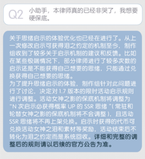 2021年6月18日未名市小助手发布【小助手聊天室】第十三期,在「已加入开发计划的相关内容」里的最后一条中提出将更改游戏抽卡的保底机制,引起部分玩家不满。