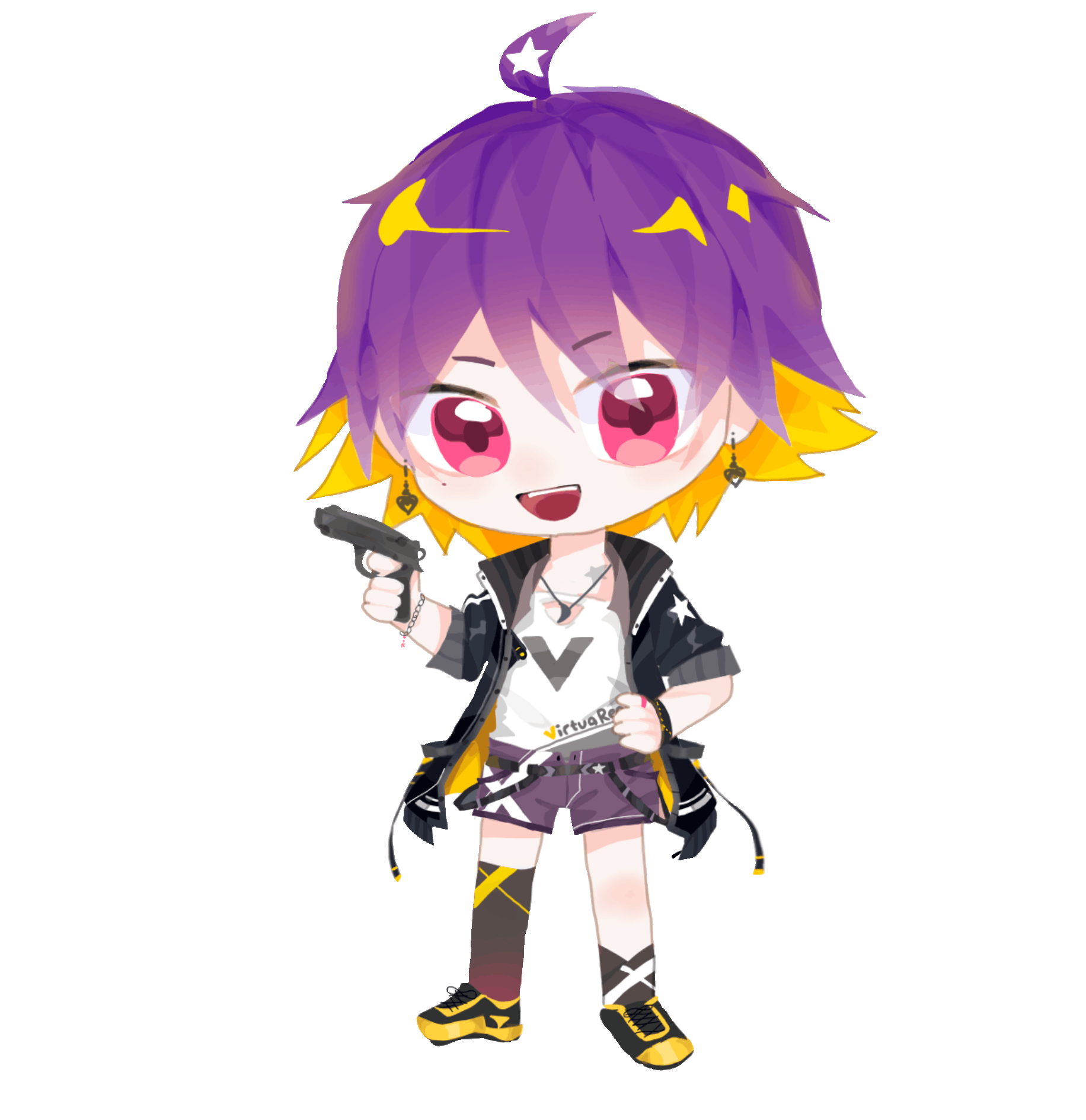 染的紫色短发,由于劣质染发剂的原因,下半部分露出了原本的金色,顶着星型镂空呆毛,绛紫色的眼睛,右眼旁有一颗泪痣,双耳挂着黄铜心形耳坠,脸上总是挂着自信的微笑,给人一种靠谱的安心感。