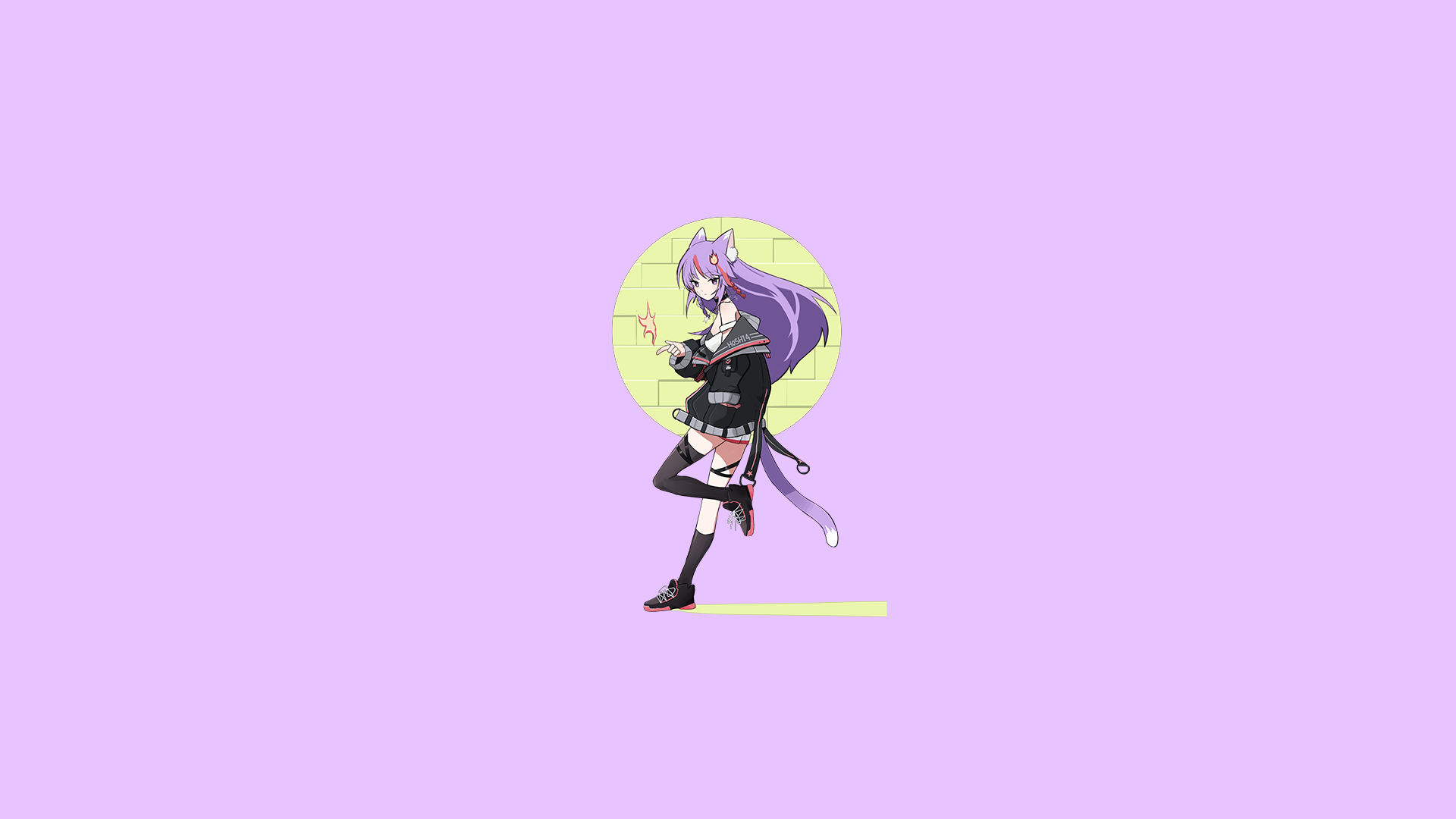 - 装束:机车风外套、可爱的白粉色相间打底吊带与短裙、一只长一只短的黑色丝袜、不知为何用的黑色腿环。