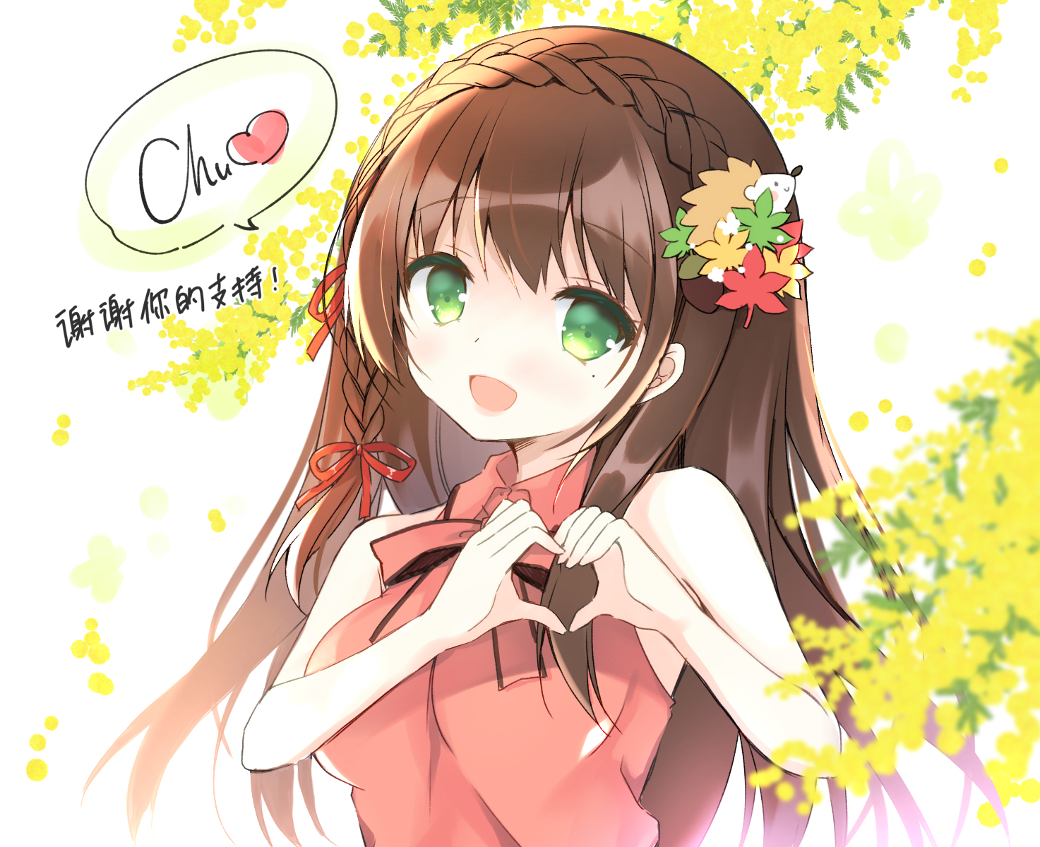 裙子的图案是落叶,胸前有一条丝带,头饰是一只小刺猬🦔,无呆毛哦(⑉• •⑉)