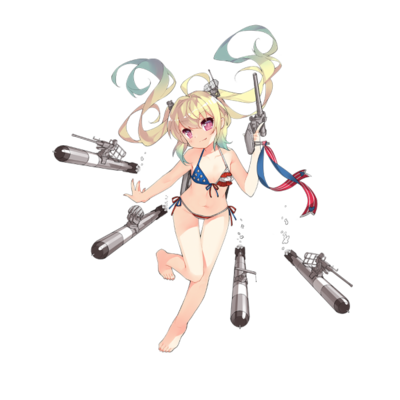 再举个例子:中国画师Saru为《战舰少女》创作的美海军舰娘大青花鱼和射水鱼,和香蕉君如出一辙的美国国旗比基尼泳装,以至于有些玩家因此联想起了香蕉君。
