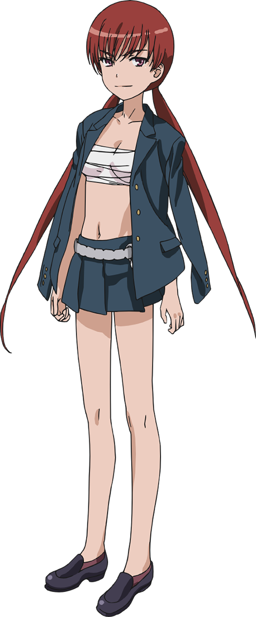 红色长发系在身后,和双马尾有些区别。 穿着带金属带扣的冬季校服迷你裙,上半身只用桃色的布(动画中为白色的绷带)遮起胸部披着运动夹克。