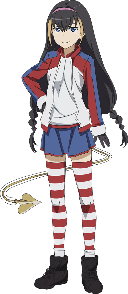 年纪约十二、三岁的小恶魔系少女,皮肤白皙,个头娇小的初中生模样。戴着粉色发箍,黑长直及腰,只在发尾部分扎成辫子。两鬓染成了橙色,看上去活泼可爱。性格粗枝大叶,有点死脑筋。拥有超乎寻常的自我中心思路,经常在回答问题到一半时进入到自言自语模式。