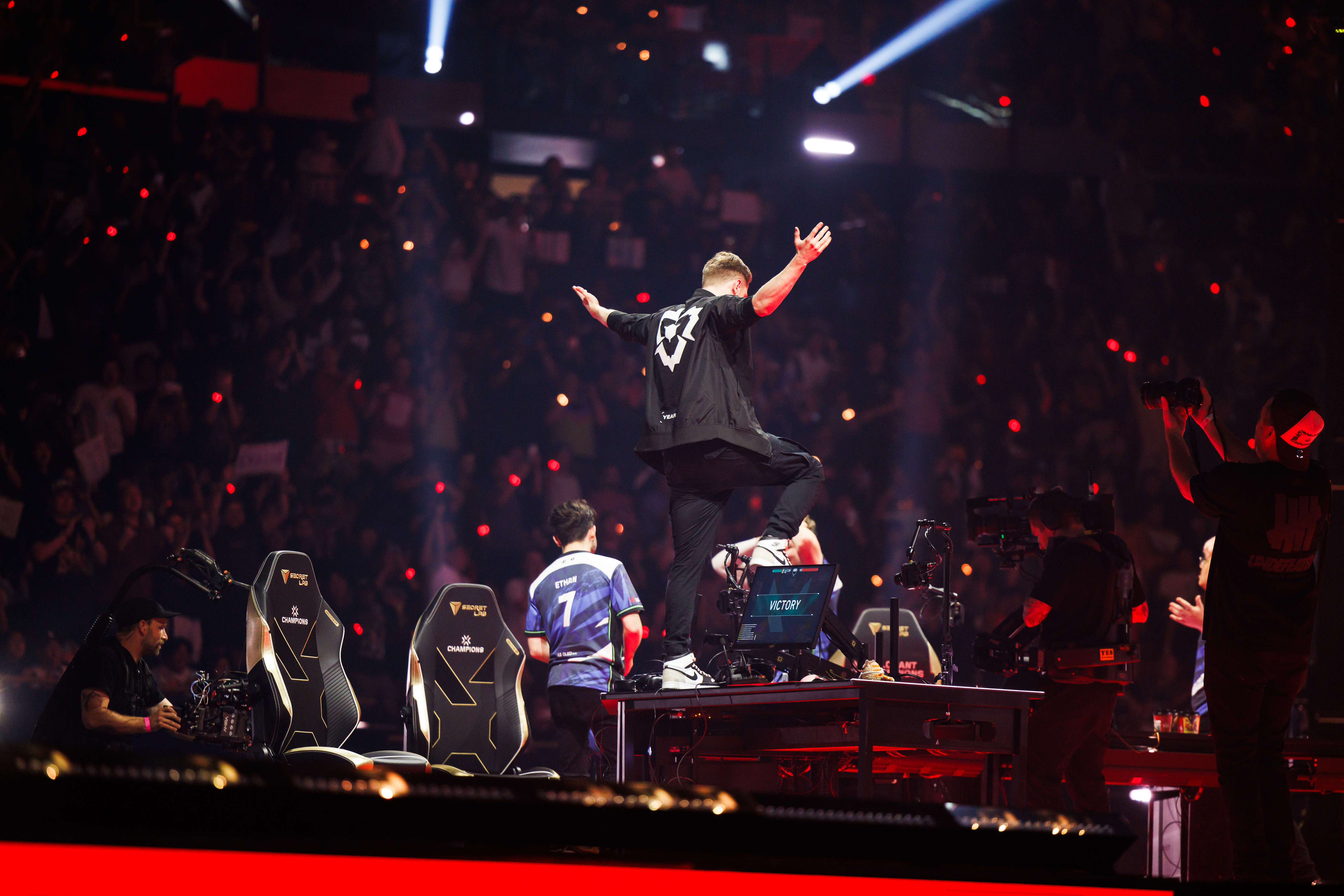 - 而在洛杉矶冠军赛则成为了Demon1的高光时刻。首先他带领EG连续两个2:0击败T1与FPX小组出线,并且在对阵FPX的比赛多次鞭尸引起争议,结合先前Boostio对CN赛区的言论让淘汰赛第一轮对阵EDG的比赛的场外充满了火药味,随后Demon1对ZmjjKK打出对位差距,2:1击败了EDG。之后EG用裂变峡谷的战术以及Demon1的枪法2:0屠杀了DRX进入胜者组决赛,在对阵PRX的比赛中双方火药味十足,互相鞭尸的场面引起了拳头官方的警告,EG1:2被打到败者组。在败者组决赛与卫冕冠军,与已经从东京大师赛噩梦中醒来的LOUD鏖战五局,3:2击败对手挺进决赛。在决赛面对志在夺冠的PRX以及Jinggg,EG用更好的战术协同、jawgemo的爆发以及Demon1的定位摧毁了PRX,EG反派上位,以3:1的比分夺得了洛杉矶全球冠军赛的冠军。出道即夺冠的Demon1在台上尽情享受着属于他的时刻。