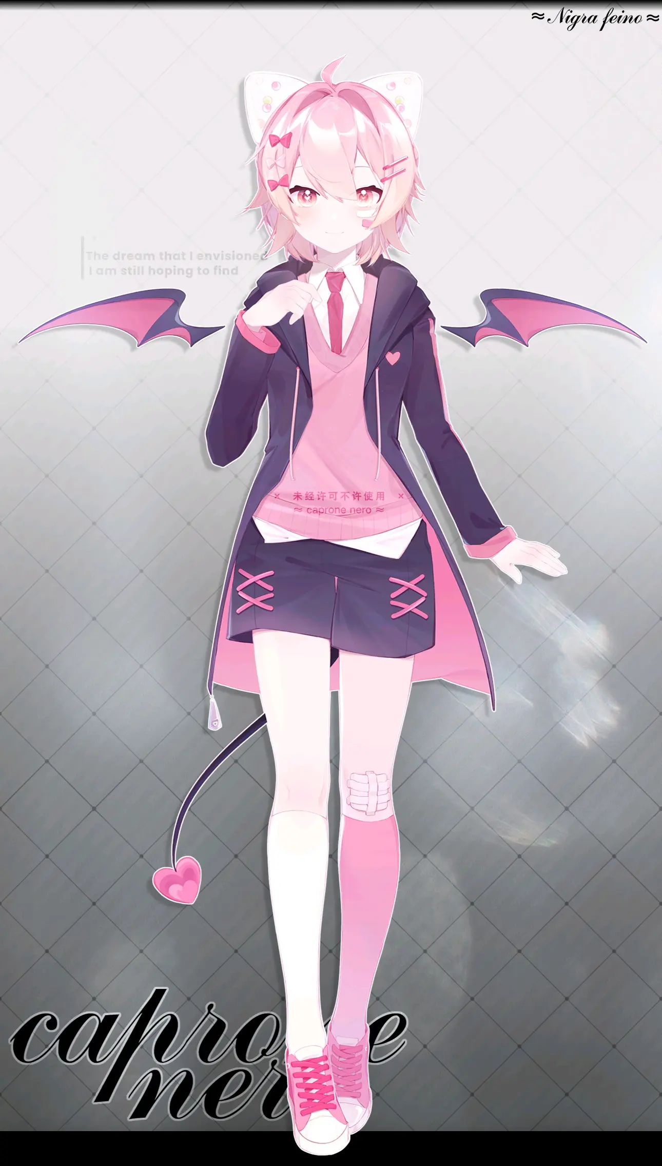 | 萌点 | 短髮、粉发、兽耳(其实是糖罐)、粉切黑、心形瞳孔、恶魔、 | |
