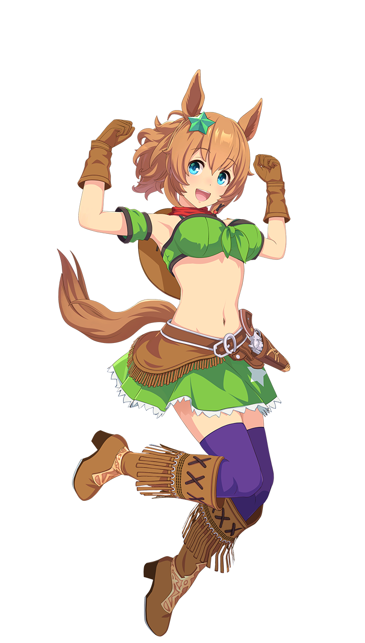 | 萌点 | 马娘、兽耳、真·马尾、单马尾、星星发饰、长身、巨乳、元气、外国人、留学生、夹杂英文、片言、露脐装、过膝袜、长靴、转轮手枪 | |