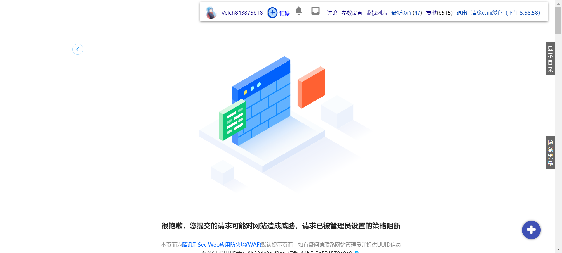 换了新皮肤后伪WAF界面又穿帮了,而且这次穿得很严重,右上角没有被白色覆盖。现在是用手机看网页版视图。