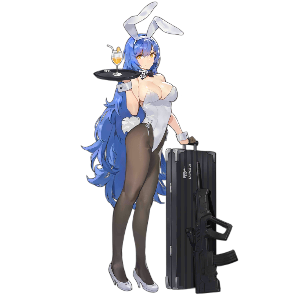 TAR21的立绘中,作为少前里少数的黑丝袜,高叉,还有两侧竖起的白耳机完全就是兔耳,让人不得不想起了兔女郎装。顺带一提,大破绘简直可以说是满足了足控的各种欲望,黑丝大破的轮廓恰好形成了蝴蝶的形状,简直令人回味无穷。宪兵!宪兵!把这些指挥官给我抓起来!