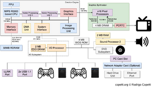 PS2的主CPU,也被称作EE(Emotion Engine),是整个PS2系统的核心。在EE中包含了真正的MIPS架构CPU核心,两个索尼定制的浮点协处理器VU,以及内部总线等部件。