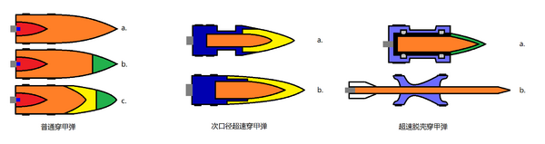 第二次世界大战是首次变迁,出现了次口径超速穿甲弹,炮弹的主体部分是高强度的弹芯(橙色),其底部由弹壳(深蓝)包裹,而顶端仅由被帽(黄色)包裹,弹芯直径小于火炮口径,在攻击目标时全靠它穿透目标,而被帽和弹壳会在命中目标的时候剥落。不像普通穿甲弹,它没有装药,其结构有线轴型(图a)和流线型(图b)两种。