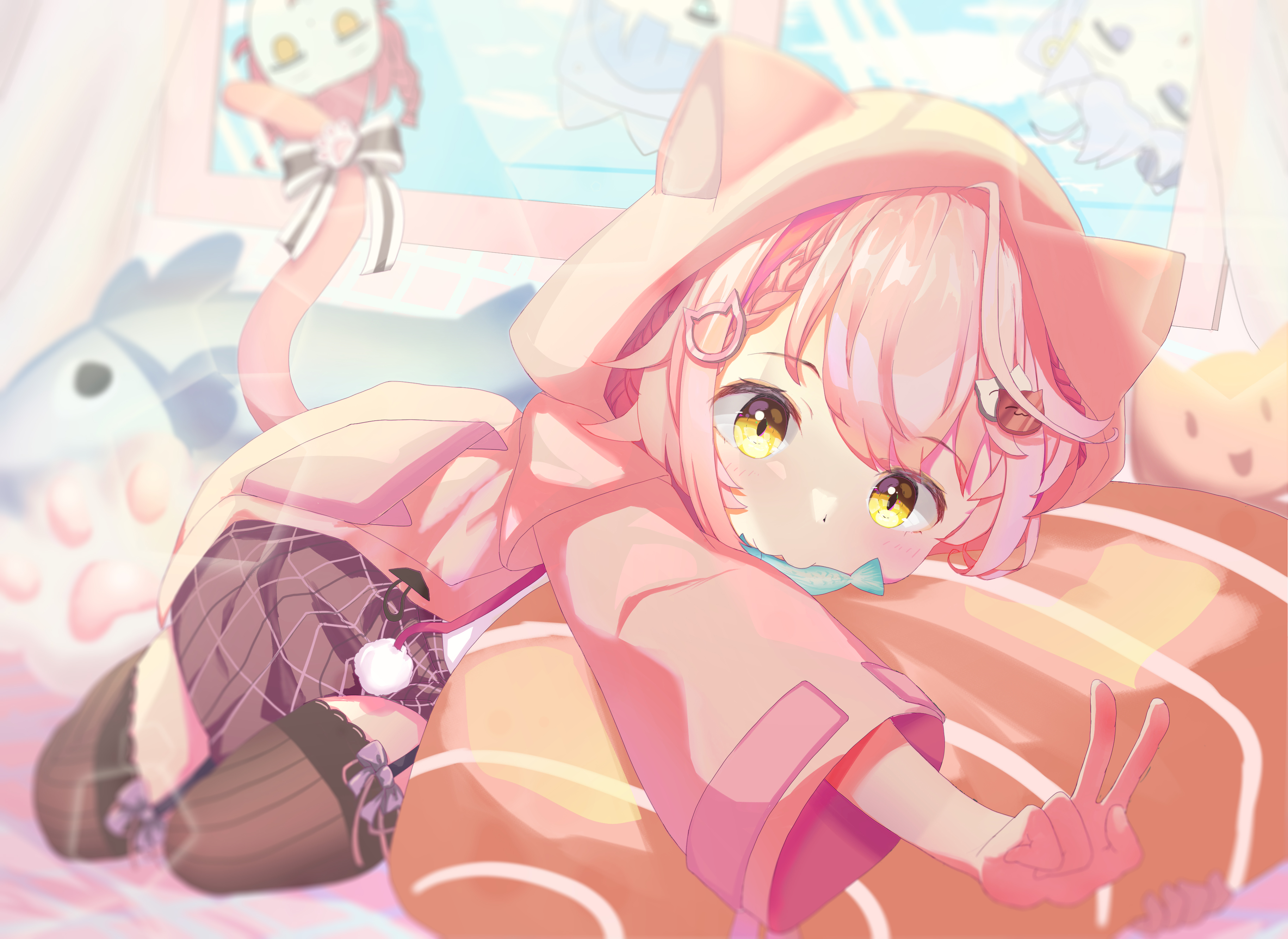 形象是一隻粉紅色大貓貓,擁有一雙靈動的耳朵。直播時主要使用英語,同時亦能使用工地日語和工地中文進行簡單對話。