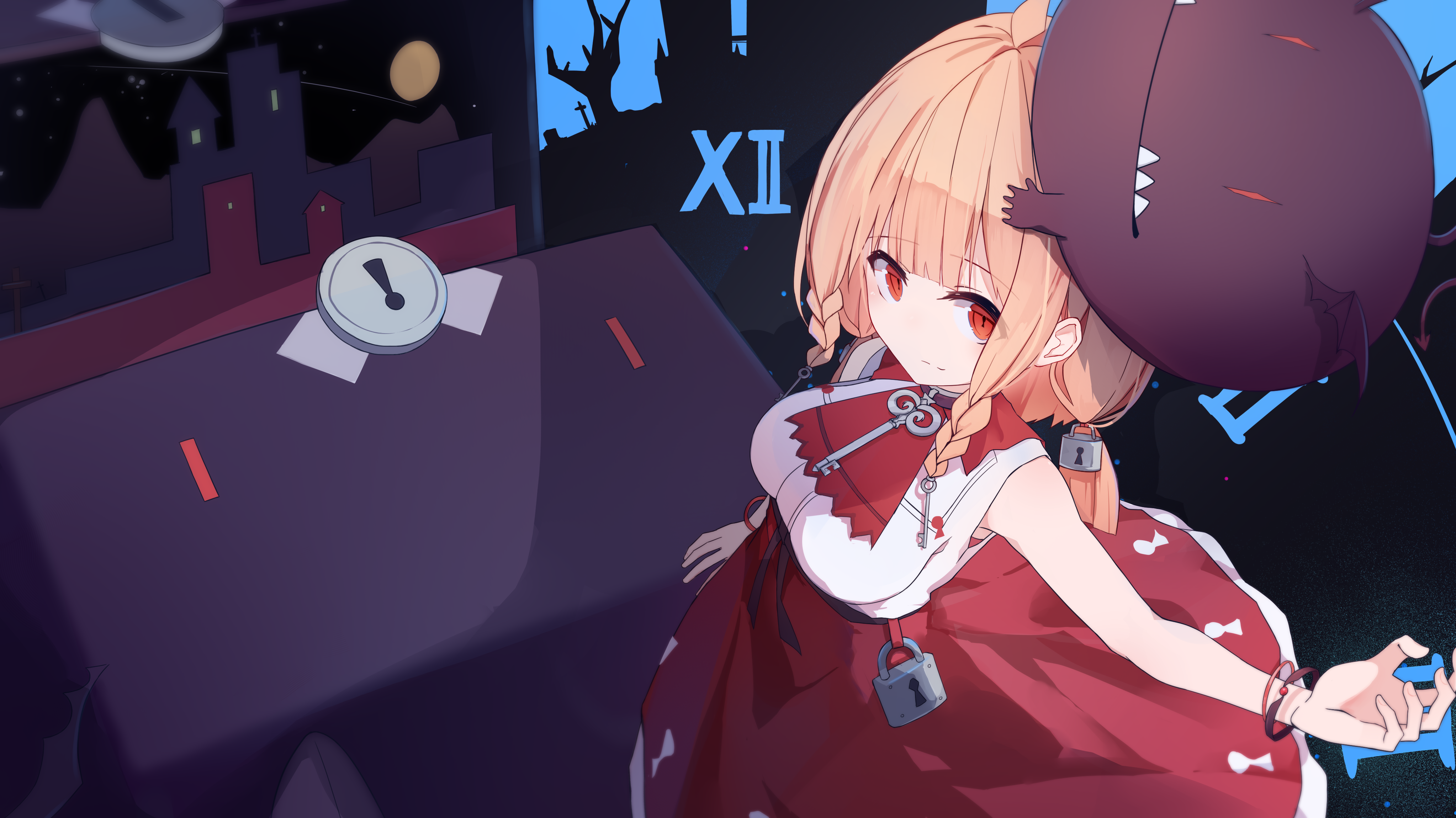 没有继承口呆口从不好好穿衣服的特点,金发平刘海附带两侧麻花辫和两天侧马尾,头发上戴着钥匙和锁。