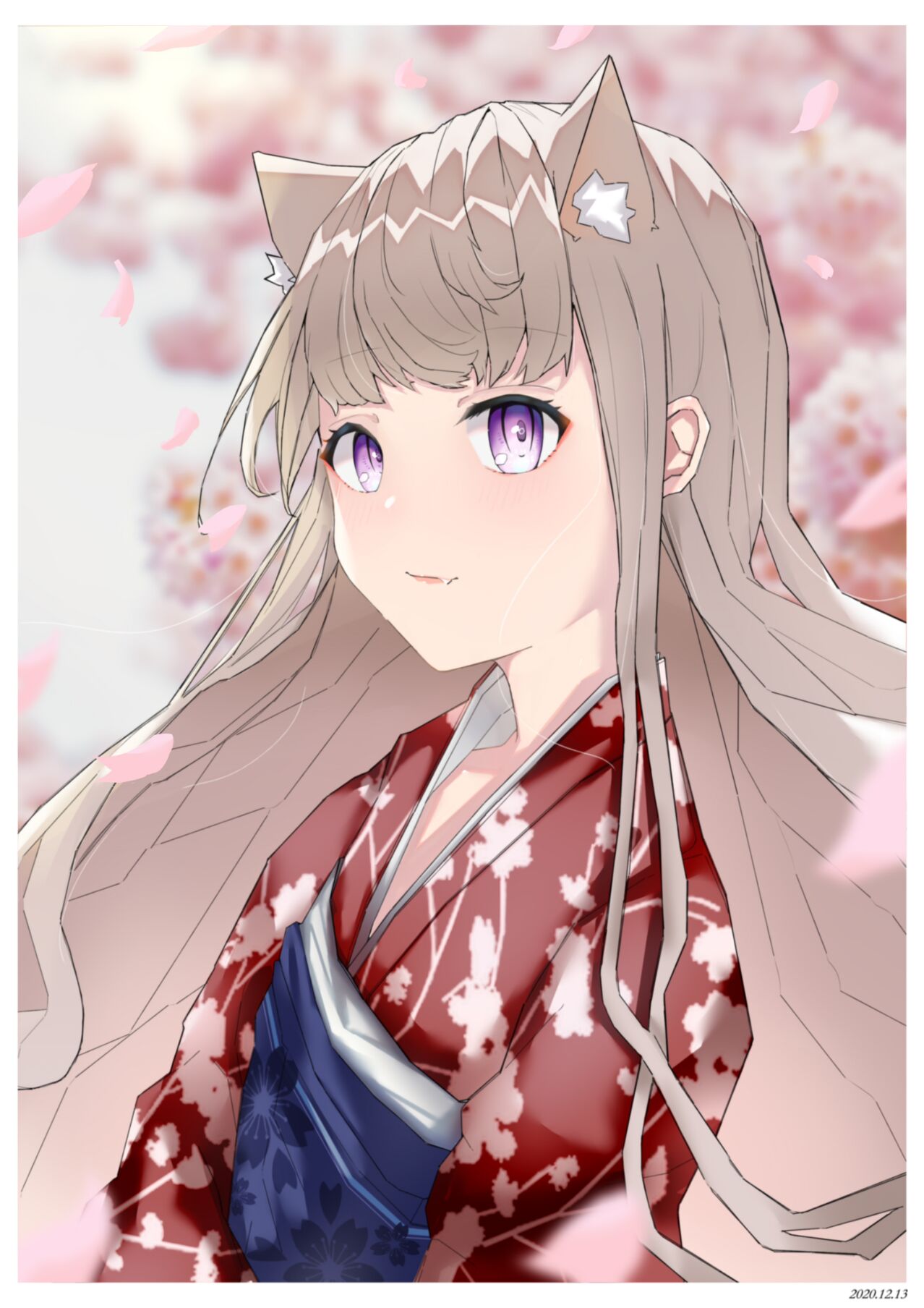 亚麻色长发长着猫耳,中间的刘海别著猫耳形状的金色发夹,耳朵两侧用紫色白边的缎带绑着蝴蝶结,尾巴上系着淡紫色的蝴蝶结。