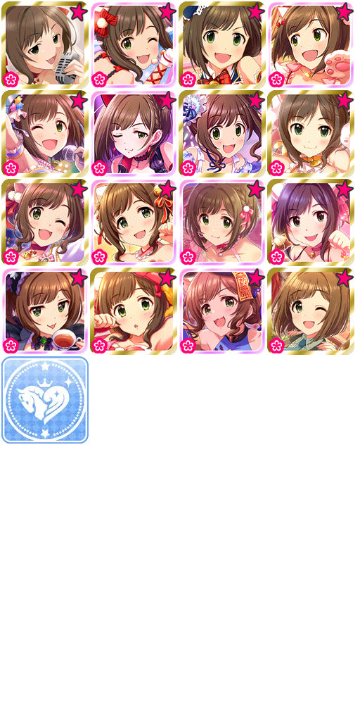 SRare[灰姑娘梦想]:2014年4月23日推出,使用30张Cinderella Dream Ticket可以交换的SR卡片。不同于该角色特训后卡面普遍为马尾猫耳娘,本卡特训后保持了短发状态,实属罕见。