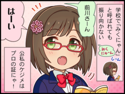 于所在的女校担任学生会长一职。偶像工作之外的前川同学是个戴眼镜的严肃女孩,语尾也不会加上“喵”字,叫她“Miku喵”她也不会答应,是个相当正经的学生。用她自己在一格漫画里的话说“公私分明才是职业(偶像)的证明喵!”
