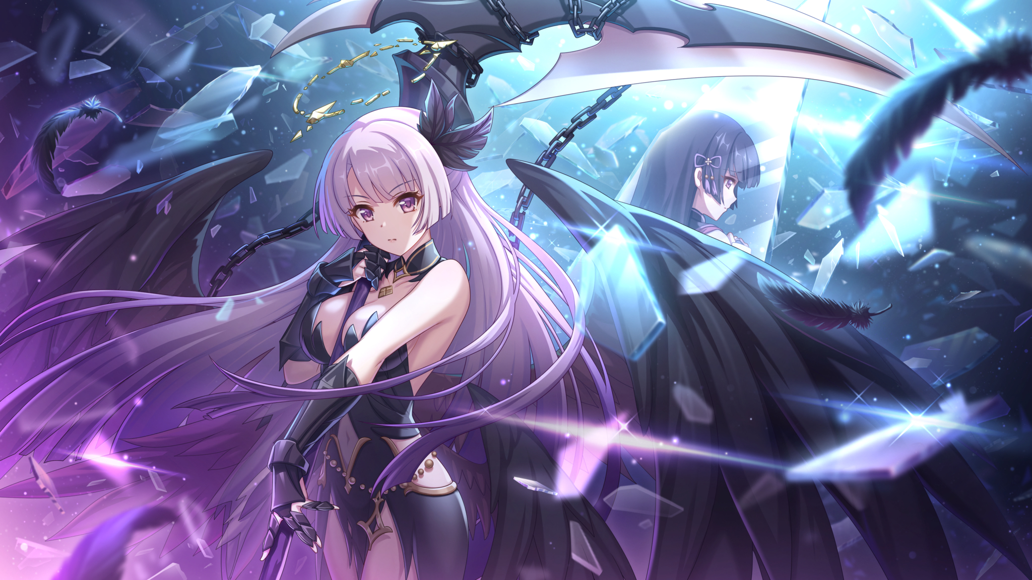 常态武器是一把紫色的薙刀,堕天使形态下是把镰刀。