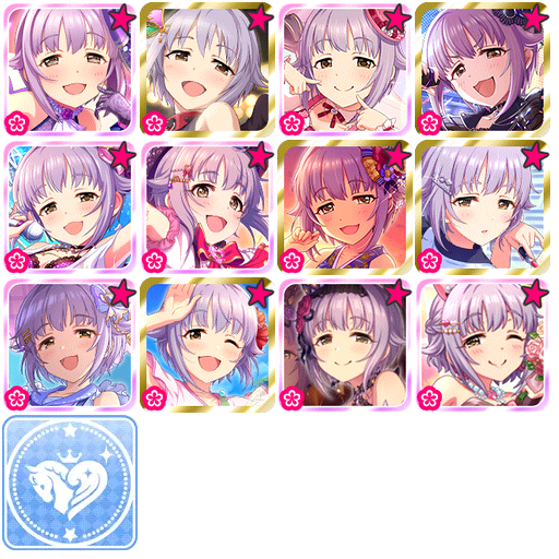 SRare[自称・可爱]:2012年6月13日推出的常驻卡片,技能名为「自称・光辉四射」。CGSS中为2016年4月30日「高高兴兴旅行扭蛋」限定SR,有solo。