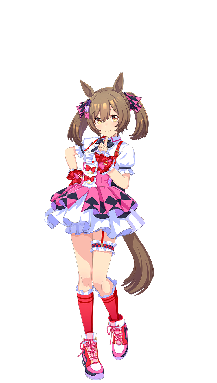 | 萌点 | 马娘、兽耳、真·马尾、双马尾、蝴蝶结、发带、及膝袜、运动鞋、包子脸、偶像、元气、口癖、特殊第一人称、睡神、差生 | |